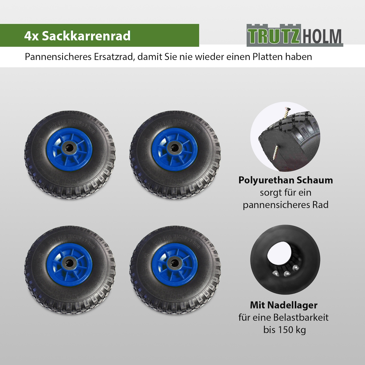 Baumarktplus 4x Sackkarrenrad PU-Rad 260x85 mm 3.00-4 75 mm zentrierte Nabe Ø 20 mm blau Vollgummi Bollerwagen