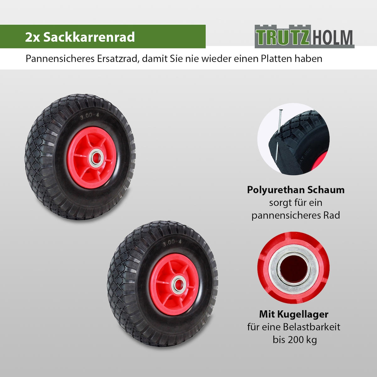 TRUTZHOLM 2x Sackkarrenrad PU-Rad 260x85 mm 3.00-4 60 mm versetze Nabe Ø 20 mm rot Vollgummi Bollerwagen