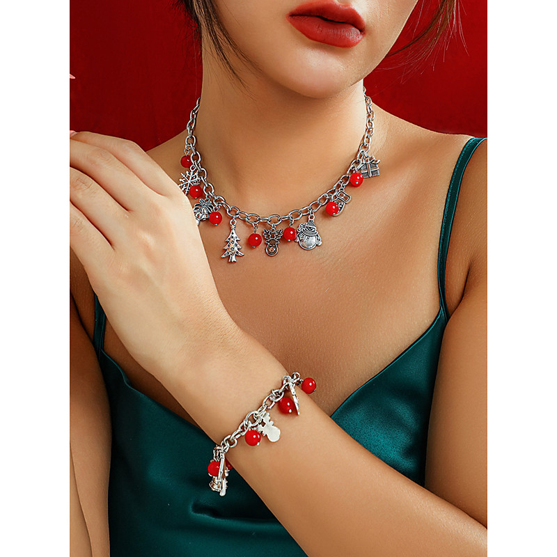Women's Christmas Charm Necklace and Bracelet Set - Silver Tone Chain with Red Beads, Snowflake, Tree and Gift Pendants, Festive Holiday Jewelry for Parties and Gifts