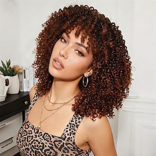 Parrucca afro riccia marrone ombre con frangia, corta 14 pollici, parrucca sintetica afro nera riccia e crespa per donna, parrucche per uso quotidiano e per feste