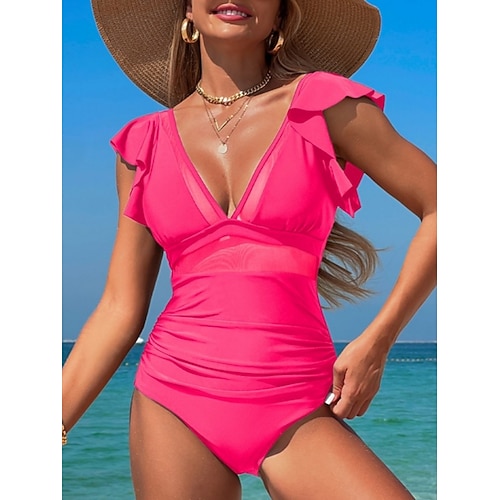 Costume da bagno intero da donna snellente sexy monokini con arricciature mesh controllo della pancia vita alta slim senza schienale abbigliamento da spiaggia per vacanze colore solido scollatura a