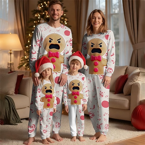 Familie Weihnachten Weihnachtspyjama für die Familie Schlafanzug Familiensets Grafik Lebkuchenmänner Heim Druck Weiß Langarm Täglich Passende Outfits