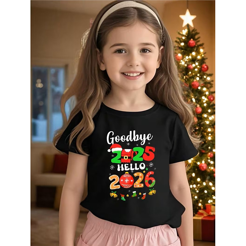 Cotton Christmas Kids Girls' 2026 New Year'S Party Black White Letter Number Printed Hat T shirt Tee Crew Neck Short Sleeve Sports Outdoor Dailywear Fashion Streetwear Printing Summer