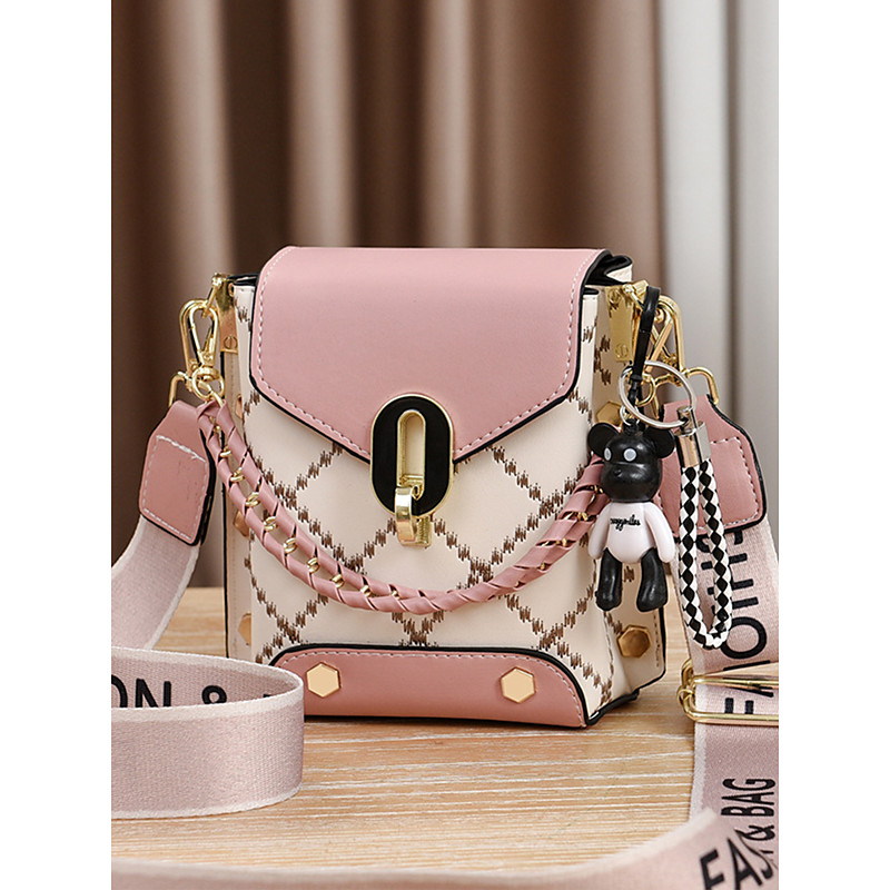 Women's Trendy Plaid Mini Shoulder Bag with Bear Charm, Chain Strap, and Colorblock Design – Perfect for Casual Outings and Daily Use Earth Yellow Black