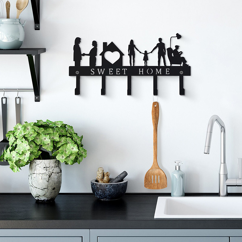 1PC Wall-mounted Sweet Home/ Coffee English Decorative Hook (Without Nails) Simple Design Iron Key Rack Suitable for Closet Behind Door Kitchen Wall Decoration and Storage