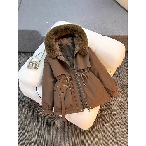 Damen Wintermantel Parka Warm Bequem Fellbesatz Reißverschluss Tasche Pelzkragen Lässig Einfarbig Urlaub Straße Lässig Alltagskleidung Regulär Mit Kapuze Normale Passform Langarm Oberbekleidung