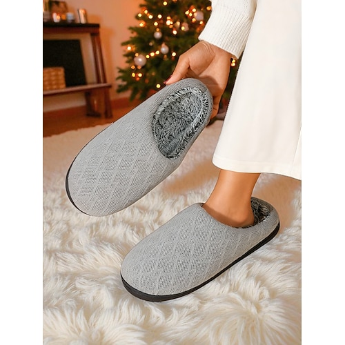 pantofole natalizie grigie da donna con fodera in peluche e stampa Believe: calde scarpe da interno per le vacanze, l'inverno e le riunioni di famiglia