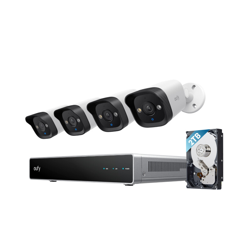 eufy PoE NVR Security System E40, 4× 4K Bullet-Kameras, verkabelte Außenkameras, 4K UHD, 122° Weitwinkel, Farbnachtsicht, 24/7-Aufnahme, KI-Erkennung, Warnlicht, 8-Kanal Netzwerkvideorekorder, 2TB HDD