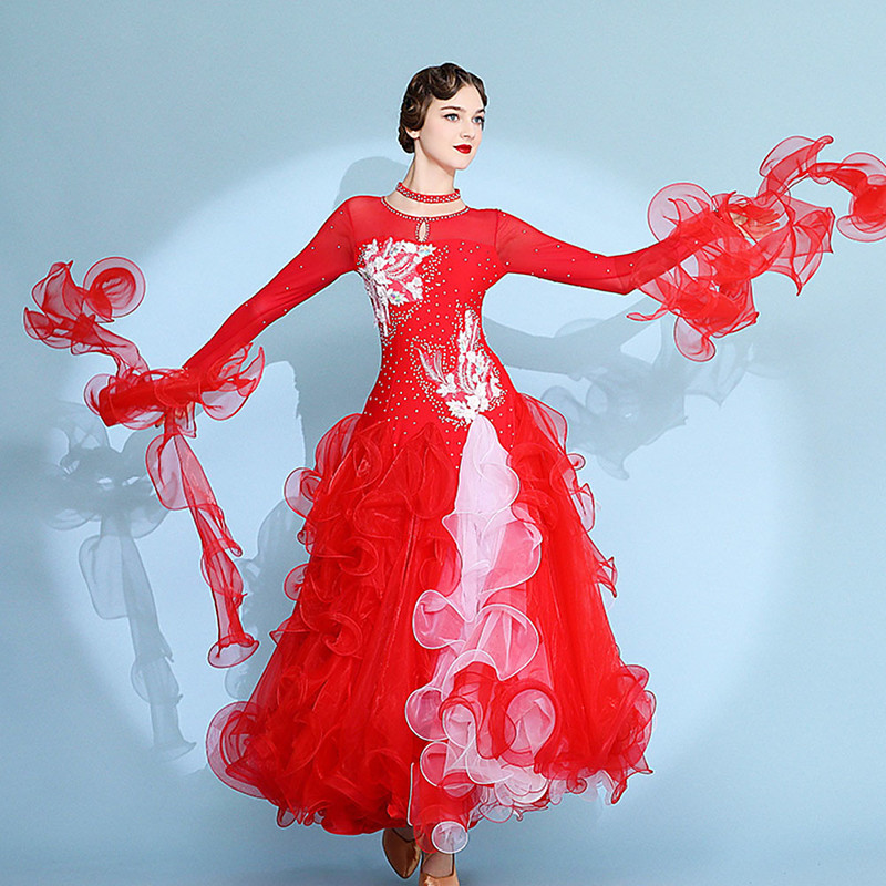 Women's Ballroom Dance Dress Ice Blue and White Crystal Rhinestone Organza Elegant Waltz Foxtrot Competition Performance Gown