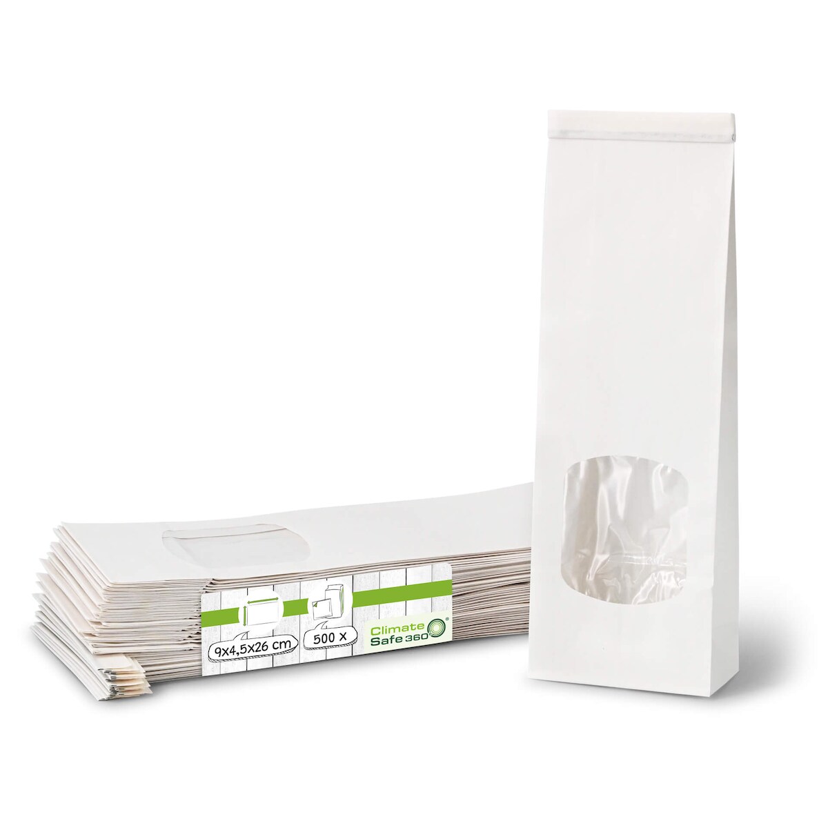 greenbox - Blockbeutel m. Fenster S, 9 x 4,5 x 26 cm, PP-Folie, weiß, Clipband, Kraftpapier, 500 St.