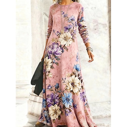 Per donna Abito Lungo Maxi Abito Vestito Casual Vestito a ruota Abito Boho Vintage Quotidiano All'aperto Weekend Vestibilità comoda Floreale Manica Lunga Girocollo Rosa Primavera Autunno Inverno