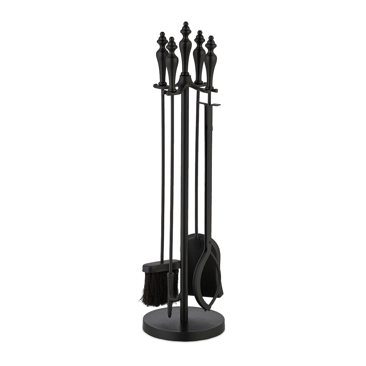 Relaxdays Kaminbesteck, 5-tlg. Set, Schürhaken, Ascheschaufel, Besen, Zange & Ständer, Kamingarnitur Vintage, schwarz