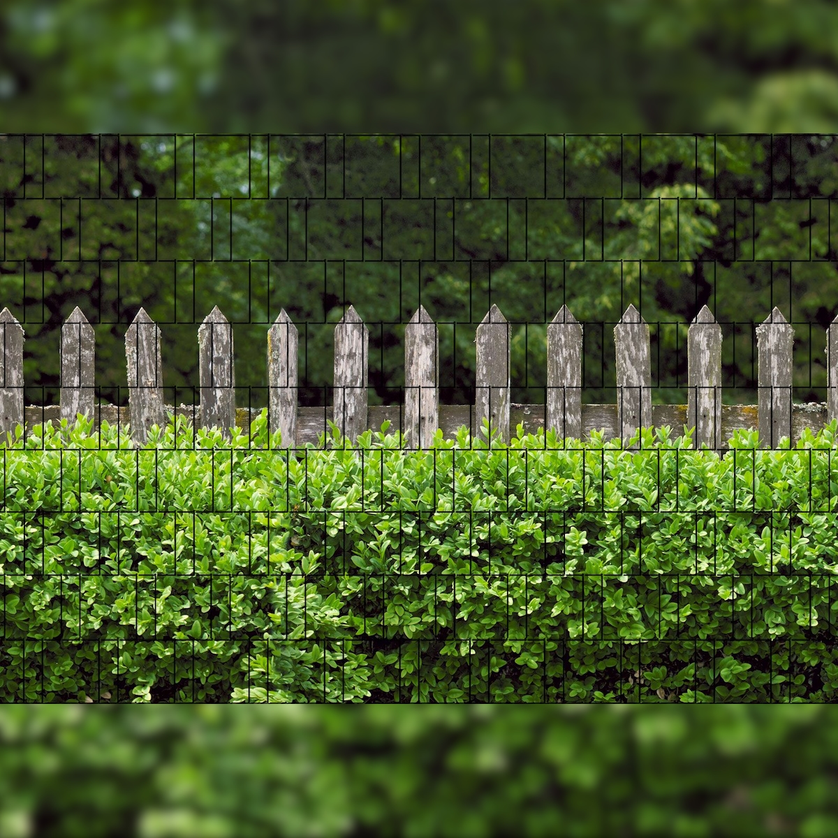 zaun|zu® Sichtschutzstreifen Holzzaun & Buxus - Bedruckter Sichtschutz 2,5m x 1,8m