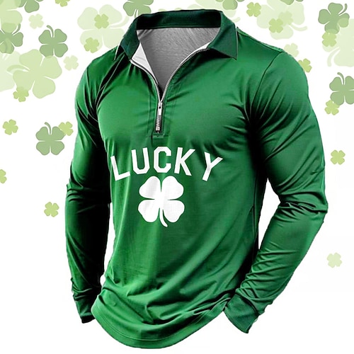 San Patrizio Per uomo Testo Polo con zip Manica Lunga Magliette polo Bavero Casual All'aperto Abito da festa Stampa 3D Primavera Autunno Nero Blu marino Verde