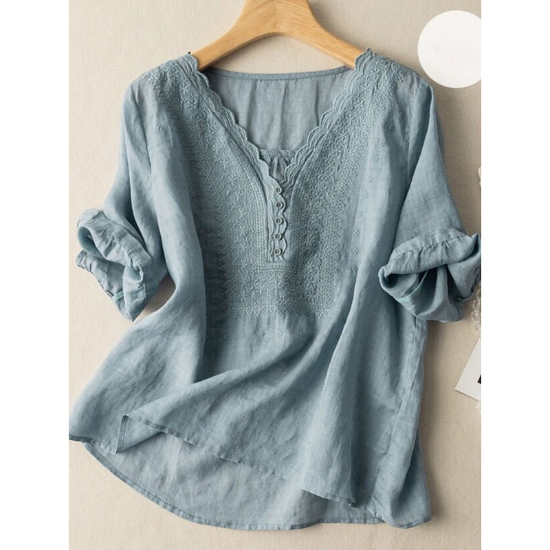 Women's Cotton Linen Shirts Solid Color Basic Casual 3/4 Length Sleeve V Neck Regular Tops Daily Lace Patchwork White Pink Sky Blue Summer