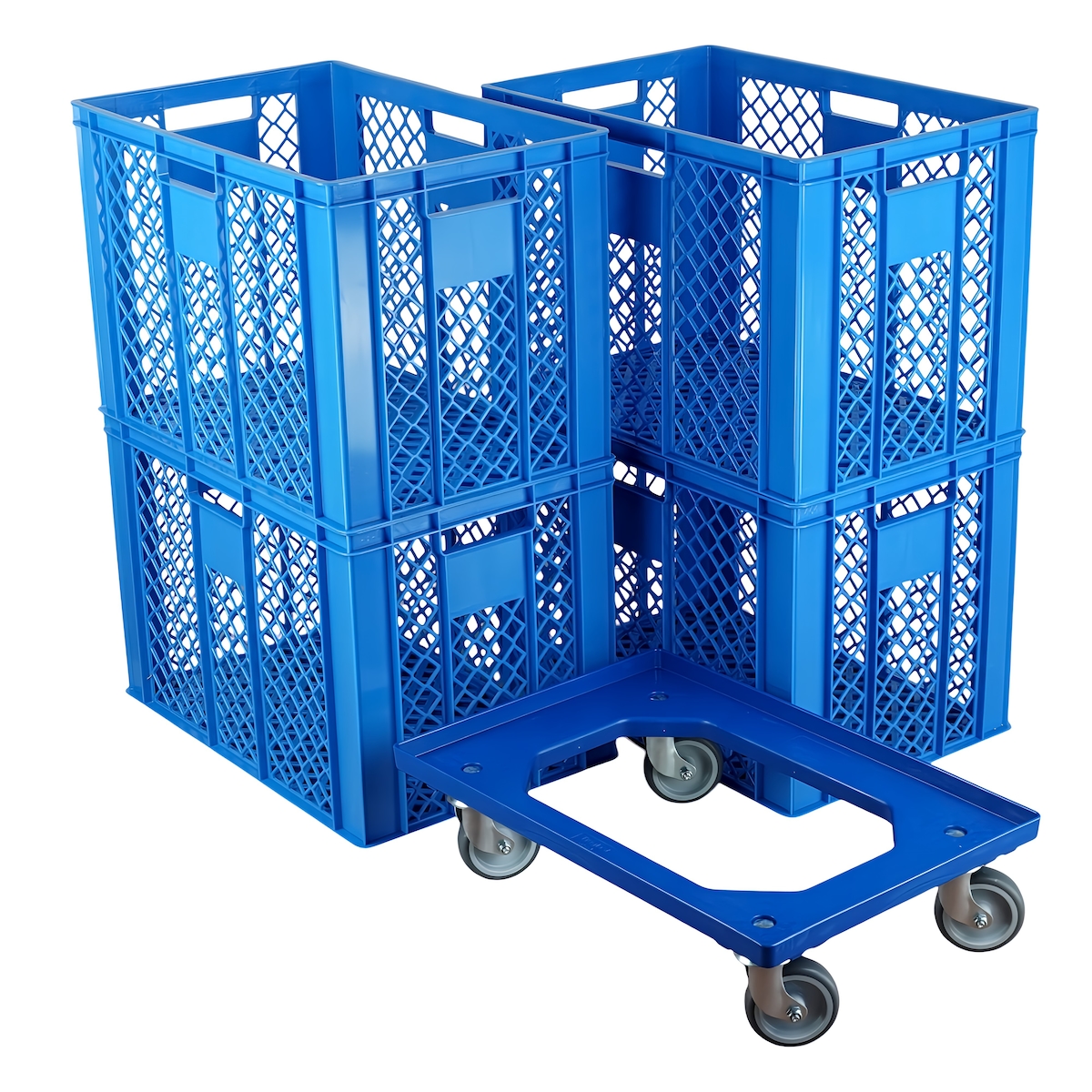 4 Stück Bäckerkisten 600 x 400 x 410 mm + 1 Transportroller in blau