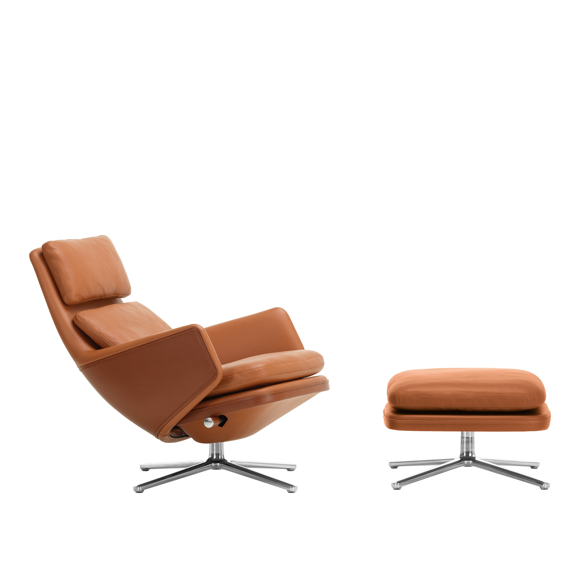 Vitra - Grand Relax + Ottoman Low, Aluminium Polished Base, Back/Seat Leather Premium Cognac, Felt Glides For Hard Floor - Fåtöljer - Antonio Citterio - Brun - Dun/MDF/Läder/Metall/Syntetiskt/Skum