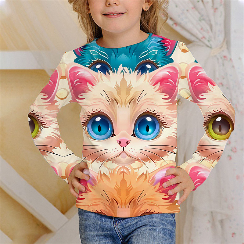 Girls' 3D Animal Cat T shirt Tee Long Sleeve Spring Fall Fashion Basic Kids 4-12 Years Crew Neck Outdoor Casual Daily Regular Fit