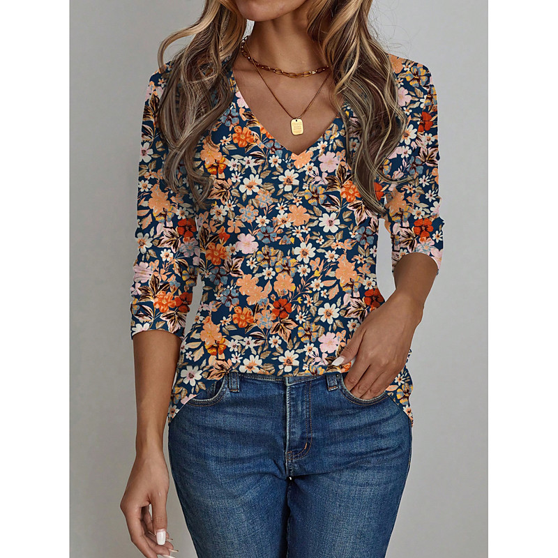 Women's T Shirt Floral Graphic Plants Vintage Stylish Classic Long Sleeve Crew Neck V Neck Round Neck Regular Tops Daily Print Blue Spring Fall