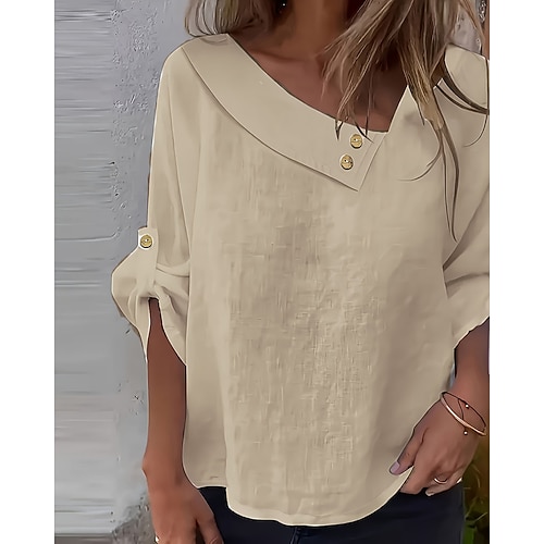 Per donna Camicie di cotone e lino Tinta unica Essenziale Casual Mezza Manica Scollo a V Top Regolari Quotidiano Bianco Rosa Blu Viola Estate