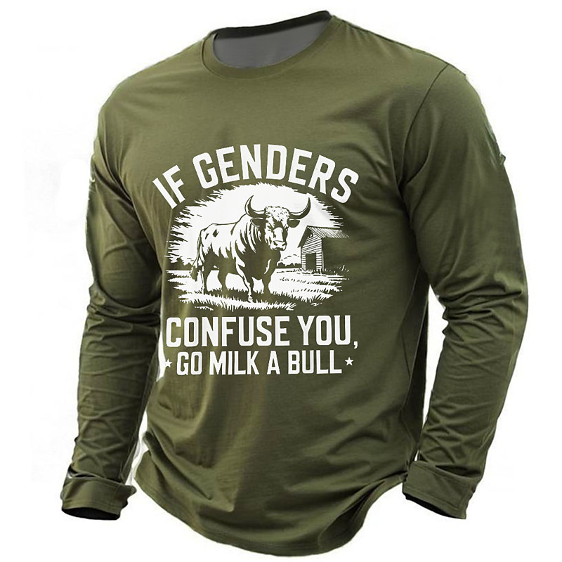 Men's Humorous Long Sleeve Graphic Tee with 'If Genders Confuse You, Go Milk A Bull' Idiomatic Wordplay Design