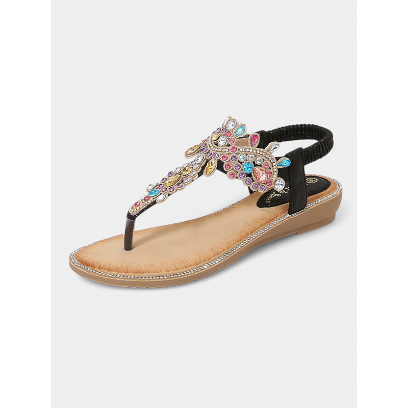 Women's Gold Rhinestone Flat Sandals – Elegant Bohemian T-Strap Sandals for Summer, Beach Vacations, and Casual Outings