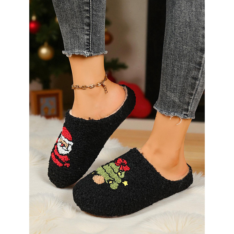 Women's Black Christmas Fuzzy Slippers with Santa Tree Embroidery – Soft Warm Indoor House Shoes, Cozy Winter Home Wear, Holiday Gift Idea