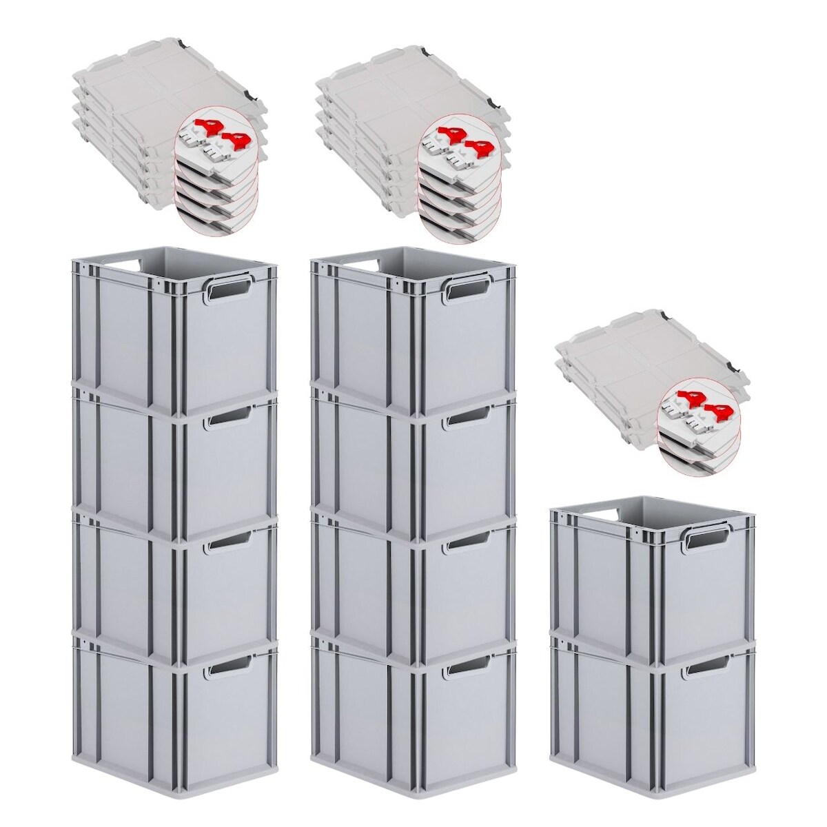 PROREGAL 10x Eurobox NextGen Grip mit Scharnierdeckel & roten Verschlüssen | HxBxT 32x30x40cm | 30 Liter | Griffe offen | Glatter Boden