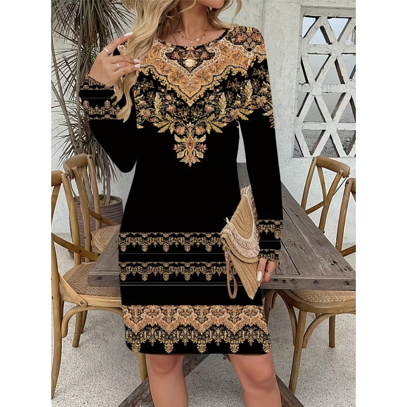 Women's Mini Dress Corset Dress Vacation Casual Boho Birthday Daily Holiday Regular Fit Graphic Paisley Tribal Long Sleeve Crew Neck Black Gold Gray Spring Fall Winter