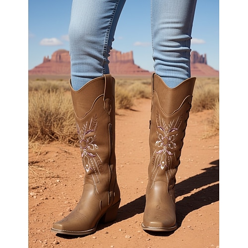 braune bestickte Overknee-Cowboystiefel zum Schnüren für Damen im Westernstil für lässige Outfits und Country-Events