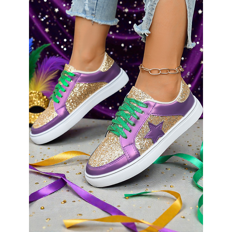 Women's Glitter Sneakers with Colorful Metallic Panels, Sparkly Festival Lace-Up Casual Shoes for Carnival Parades, Parties Street Costumes