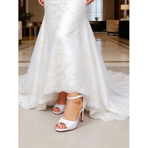 Elfenbeinfarbene Brautschuhe mit Knöchelriemen und offener Zehenpartie, elegante, minimalistische Hochzeitsschuhe für die Braut in der Stadt
