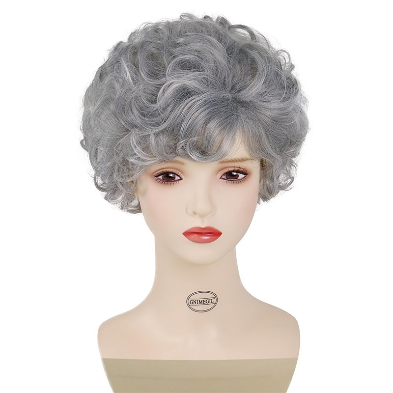 Synthetic Short Grey Curly Wigs for Senior Women Silver Grey Hair Layered Pixie Cut Hair Wig with Bangs Fluffy Wavy Wigs Old Lady Daily Granny Halloween Costume Party