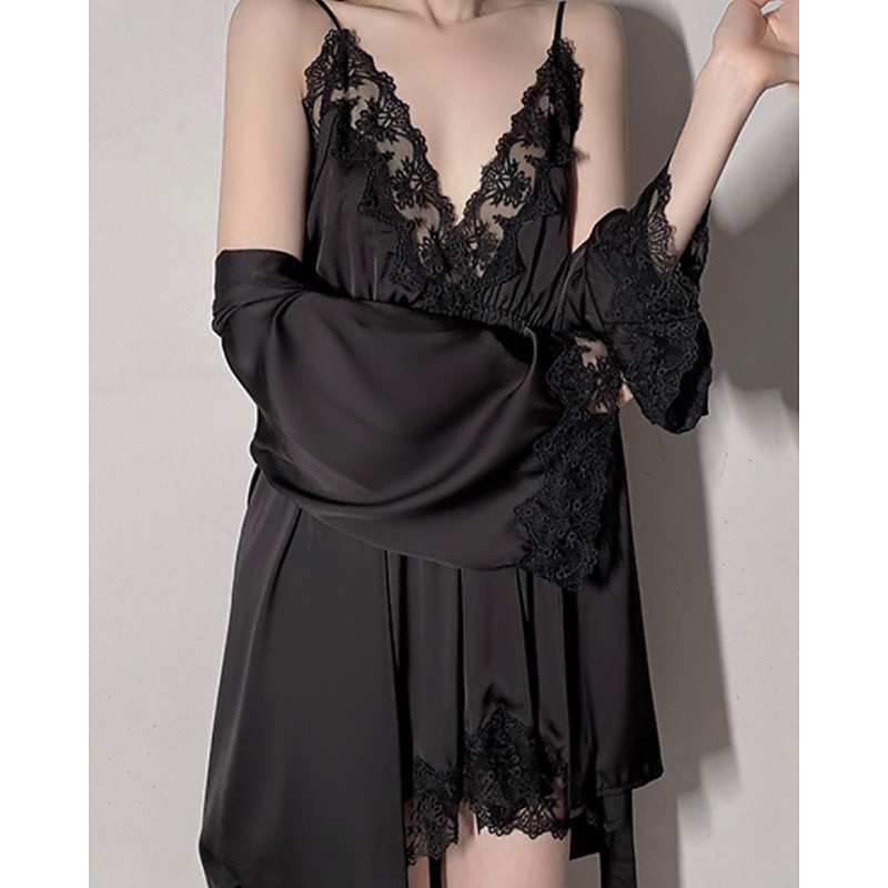 Women's Robe Nightgown Pajama Set Casual Soft Satin Pure Color Lace Dress Daily Home Bed Long Sleeve Straps Black White Pink Wine Brown Summer Regular Fit