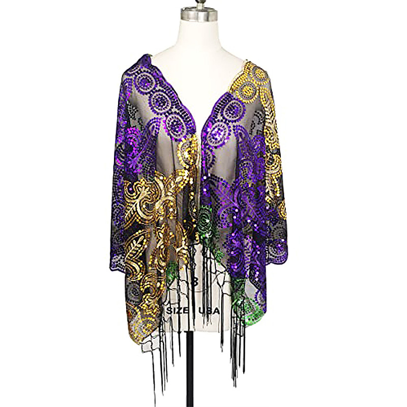 Women's Sequin Lace Cape, Polyester Material, Purple Green Design with Fringes, Perfect for Carnival Masquerade Balls