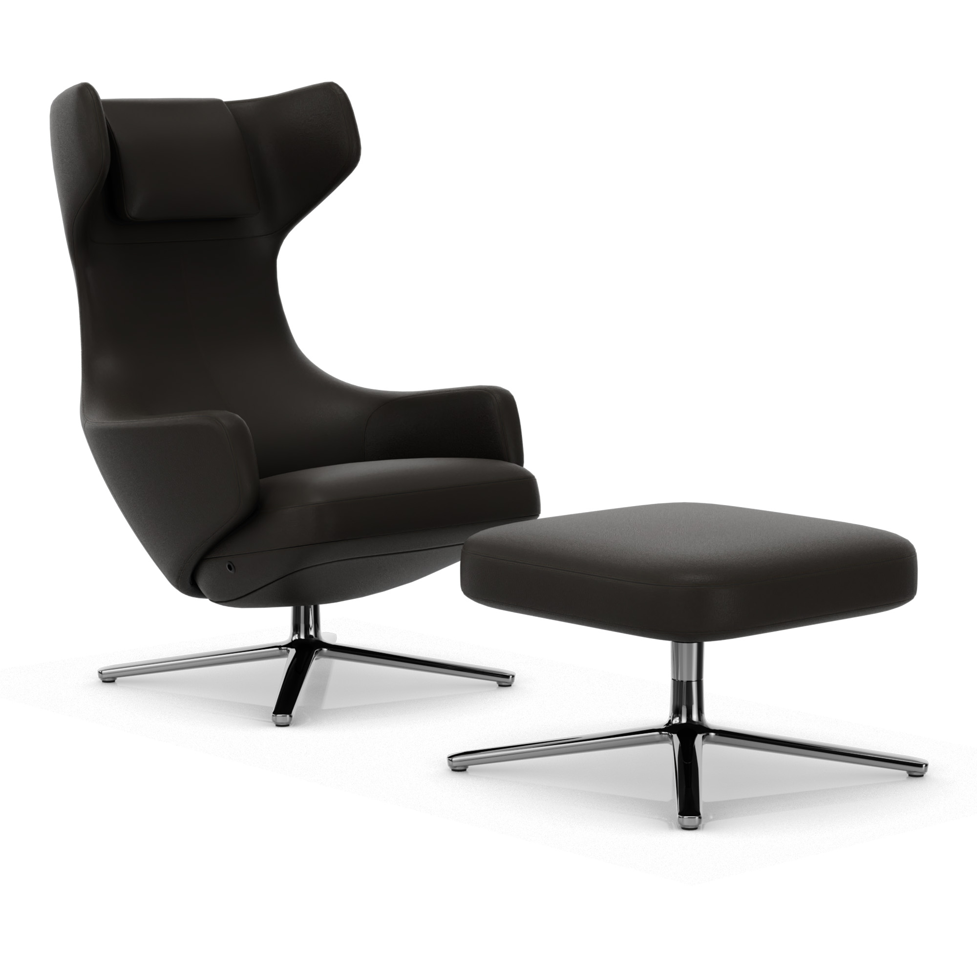 Vitra - Grand Repos & Ottoman Low, Aluminium Polished Base, Back/Seat Leather Premium L40 Chocolate - Snurrfåtöljer - Antonio Citterio - Brun - Dun/Läder/Metall/Skum/Plast