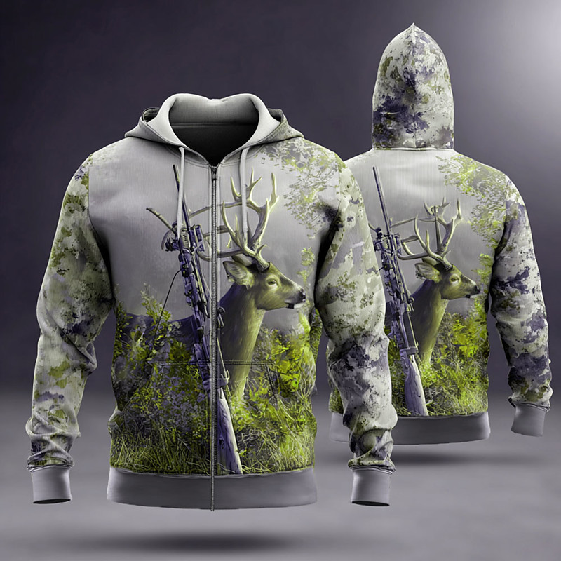 Men's Camo Deer Hoodie Jacket Sweatshirt Fashion Daily Long Sleeve Hooded Vacation Hunting Brown Green Gray Drawstring Zipper Fall Winter Designer S M L XL XXL XXXL