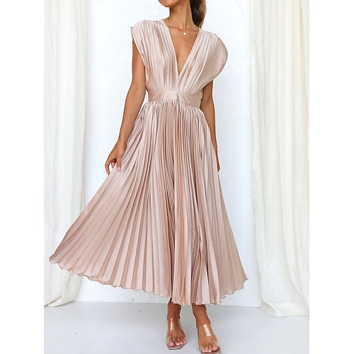 Per donna Abito Midi Abito a trapezio Abito Pieghettato Elegante Festa cocktail All'aperto Feste Ospite di nozze Vestibilità regolare Tinta unica Manica Corta Scollo a V Nero Champagne Rosso Marrone