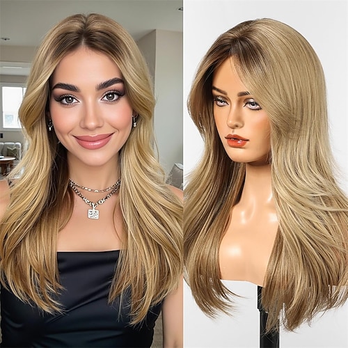 natürliche lange Perücken für Frauen mit Pony, synthetisches hitzebeständiges Haar, Ombre-braune Perücke für den täglichen Gebrauch bei Partys und Cosplay