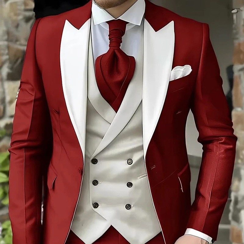 Men's Prom Spring Wedding Party Suits Peaked Lapel White Burgundy Fashion Party Patchwork Tailored Fit 3 Piece Single Breasted One-button