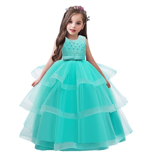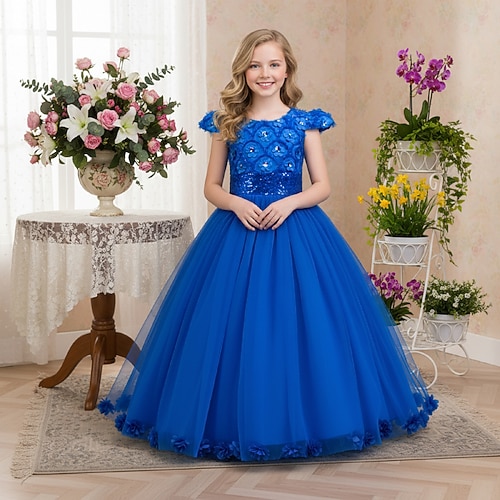 Blumenmädchenkleid Mädchen Formelle Kleidung Hochzeitskleidung Party Hochzeit Formell Elegant Mode Prinzessin Pailletten Einfarbig Ärmellos Rundhalsausschnitt Blau Silber Ab 4 Jahren