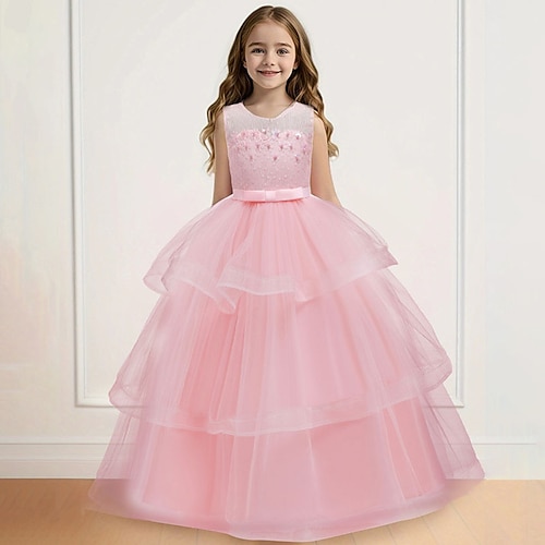 Blumenmädchenkleid Mädchen Formelle Kleidung Hochzeitskleidung Party Hochzeit Formell Niedlich Prinzessin Süß Kleid für die Erstkommunion Patchwork Netz Einfarbig Ärmellos Rundhalsausschnitt Hellrosa