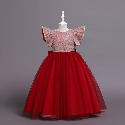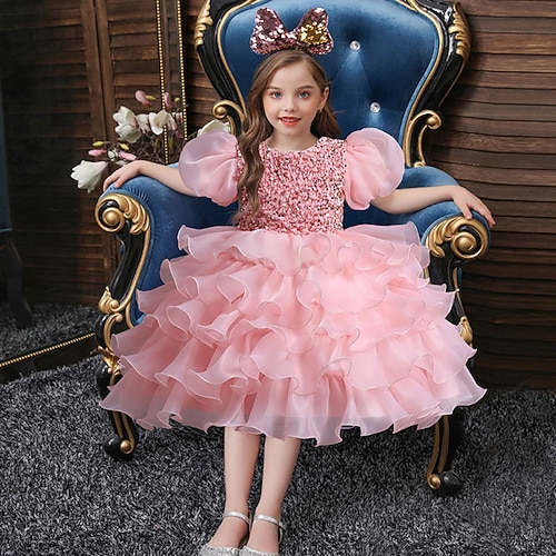 Blumenmädchenkleid Mädchen Formelle Kleidung Hochzeitskleidung Party Hochzeit Formell Prinzessin Kleid für die Erstkommunion Pailletten Patchwork Einfarbig Kurze Ärmel Rundhalsausschnitt Blau Rosa Ab