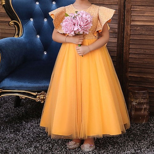 Blumenmädchenkleid Mädchen Formelle Kleidung Hochzeitskleidung Party Hochzeit Formell Niedlich Prinzessin Schön Patchwork Netz Einfarbig Kurzarm Rundhalsausschnitt Blau Champagner Ab 4 Jahren
