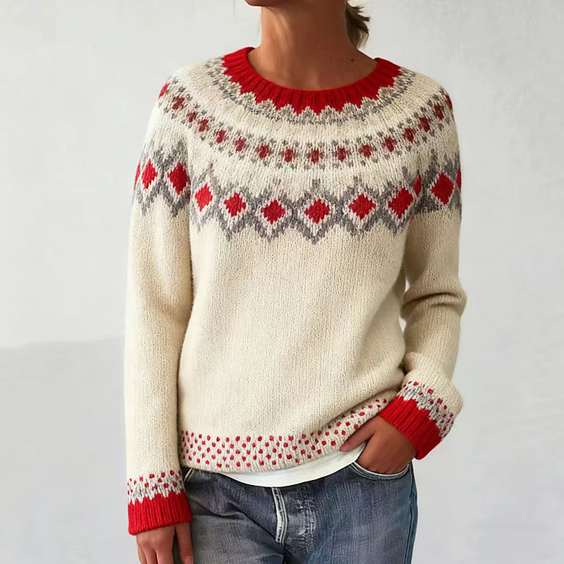 Women's Fair Isle Sweater Pullover Elegant Vintage Streetwear Geometric Ribbed Crew Neck Floral Long Sleeve Regular Tops Knit School Outdoor Home White Red Spring Fall