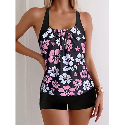 Tankini da donna costume da bagno a 2 pezzi pantaloncini controllo della pancia vita alta slim schiena scoperta abbigliamento da spiaggia per vacanze floreale collo a U costumi da bagno senza maniche
