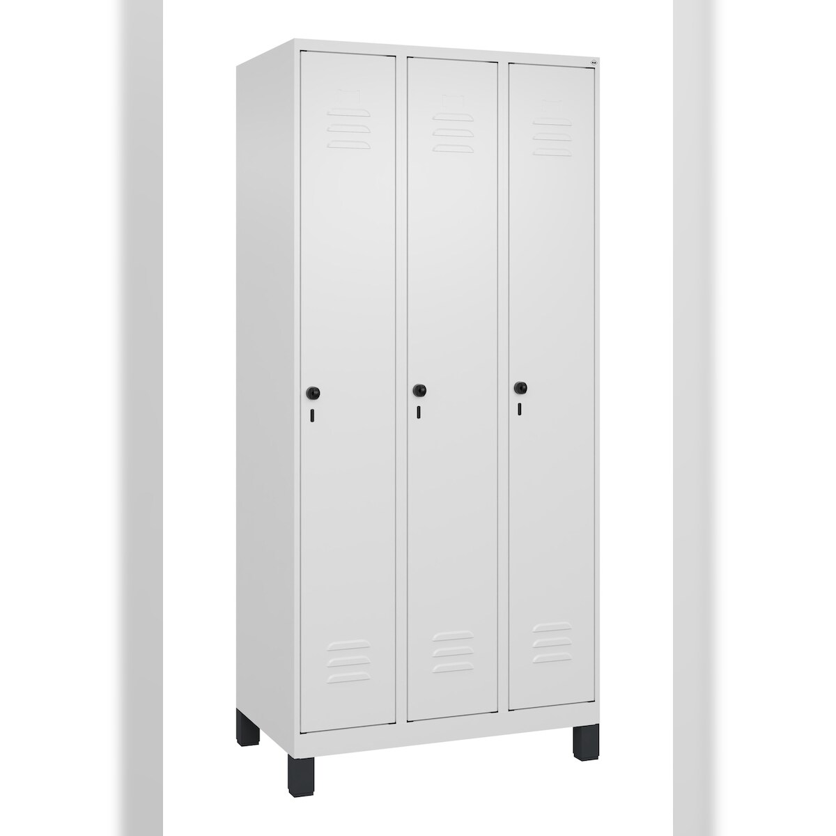 Spind Evolo PLUS, 3 Abteile, lichtgrau, B 900 mm, mit Bodensockel, Zylinderschloss C+P