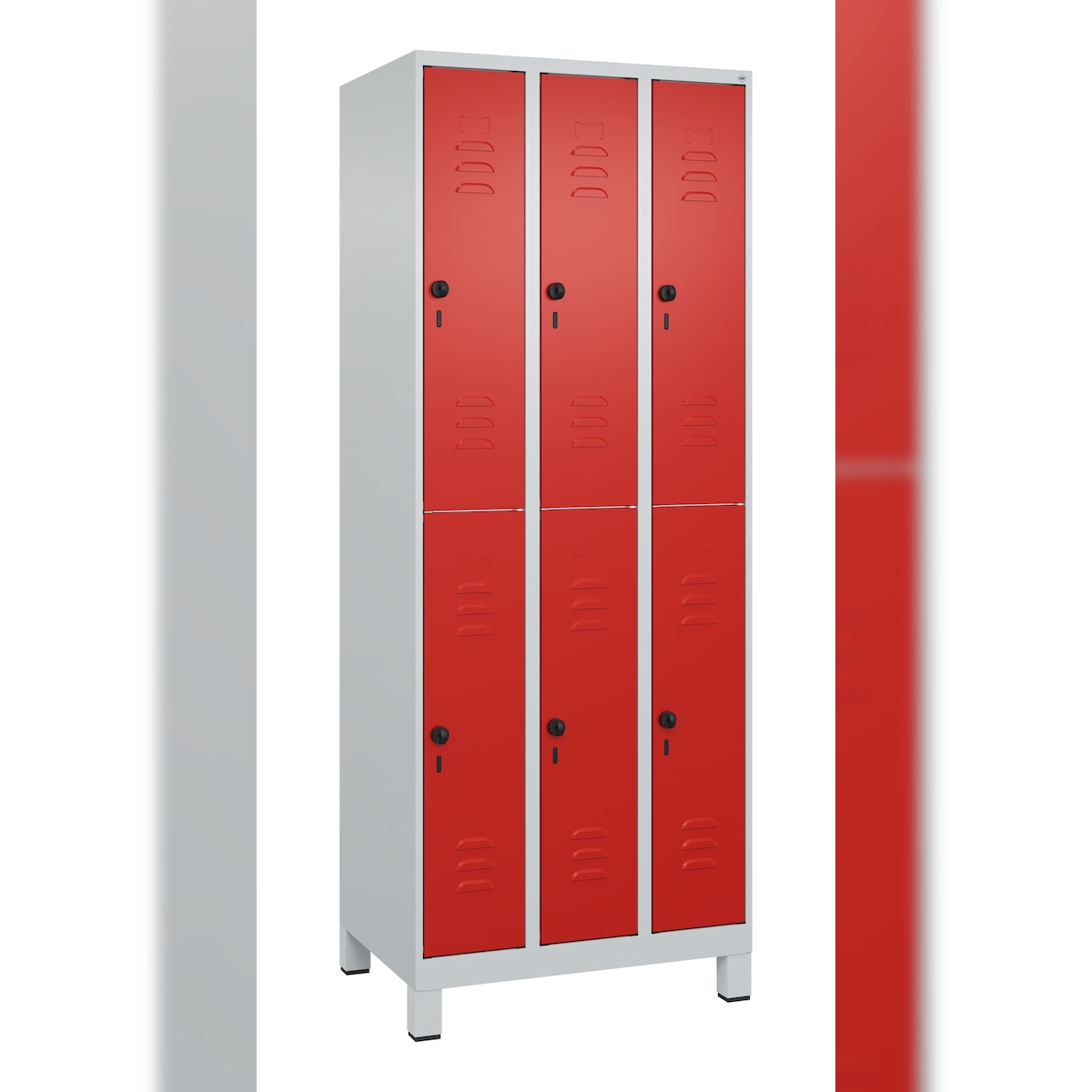 C+P Spind Classic PLUS, Sockel, 3 Abteile, HxBxT 195x120x50cm, Zylinderschloss, Hellgrau/Rot von PROREGAL