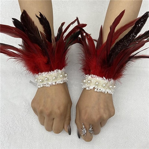 polsini da polso in piuma verde da donna con pizzo di perle bianche, 1 paio di braccialetti con piume naturali, accessori per costumi