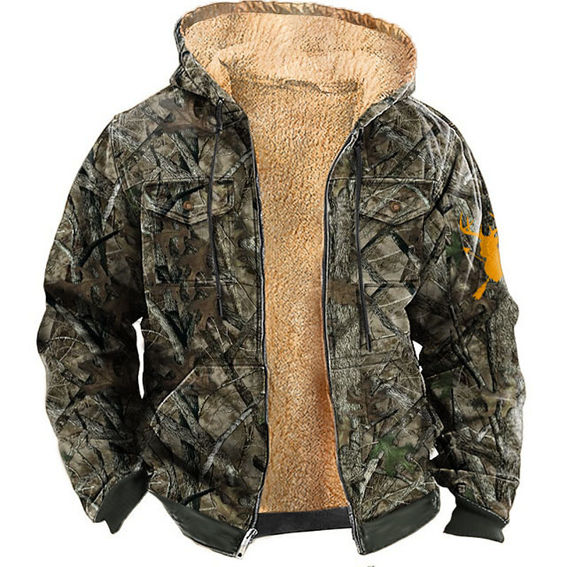 Men's Camo Camouflage Deer Fleece Hoodie Jacket Sweatshirt Classic Military Hunting Long Sleeve Crew Neck Outdoor Camping Khaki Army Green Gray Zip Up Fall Winter Designer S M L XL 2XL 3XL